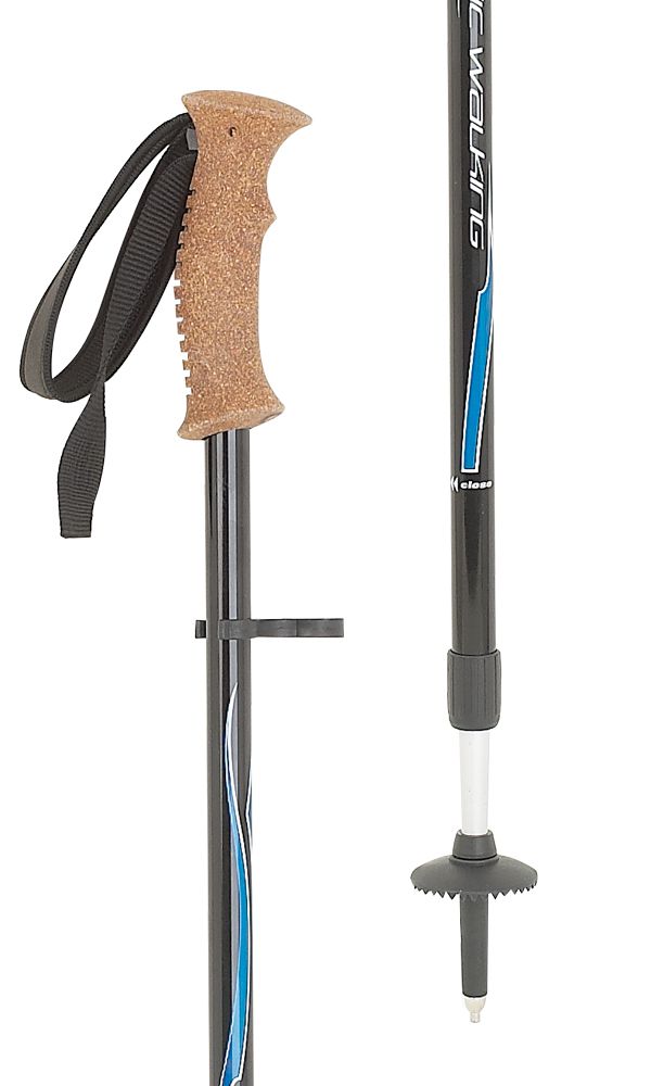 The nordic walking pole is made from a strong and lightweight aluminium construction. Adjustable in height it features an ergonomic cork handle, comfortable wrist strap and shock absorbing insert. The carbide steel tip and removable rubber ferrule make this hiking pole suitable for all types of walking surface.