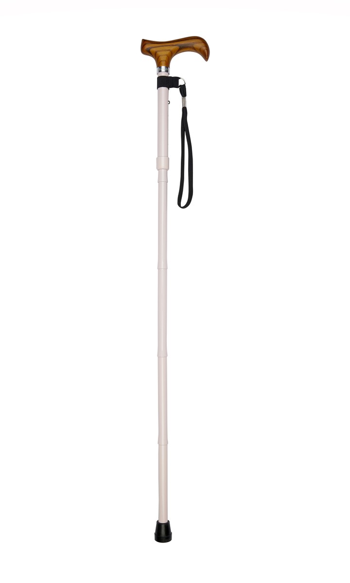 The aluminium walking stick is strong and lightweight and features a comfortable wooden derby-style handle.
