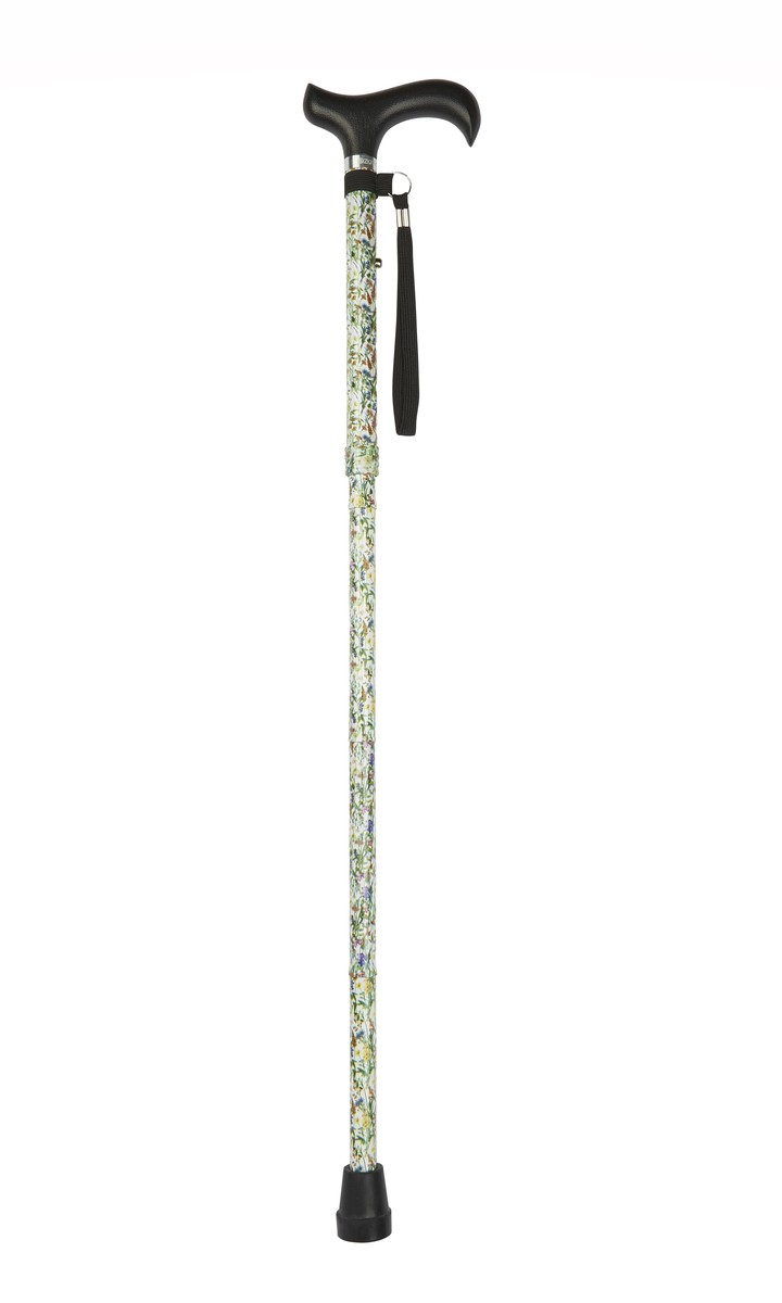 The aluminium walking stick is strong and lightweight and features a comfortable plastic derby-style handle.