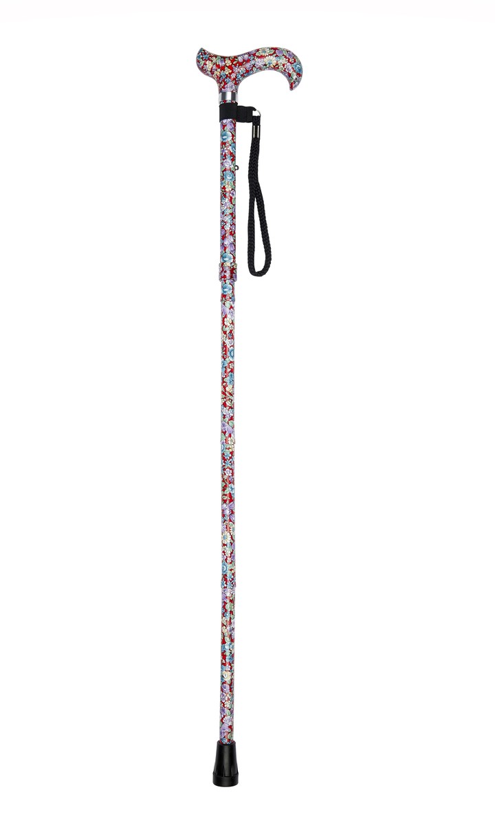 The aluminium walking stick is strong and lightweight and features a comfortable patterned plastic derby-style handle.
