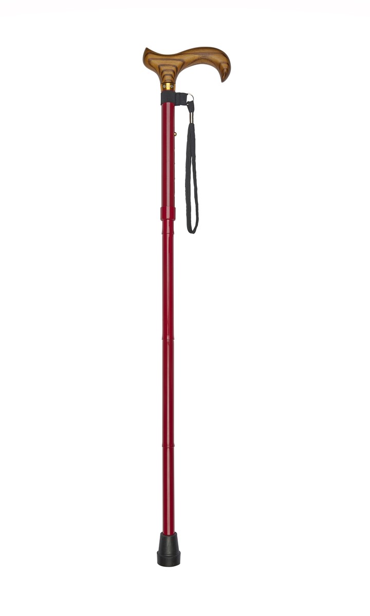 The aluminium walking stick is strong and lightweight and features a comfortable wooden derby-style handle.