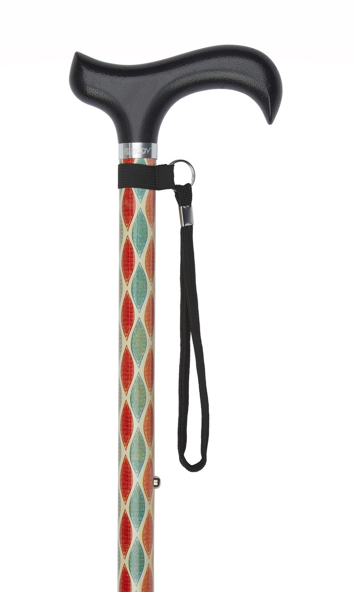 The aluminium walking stick features a comfortable plastic derby-style handle and includes a wrist cord and ferrule for added security and stability.