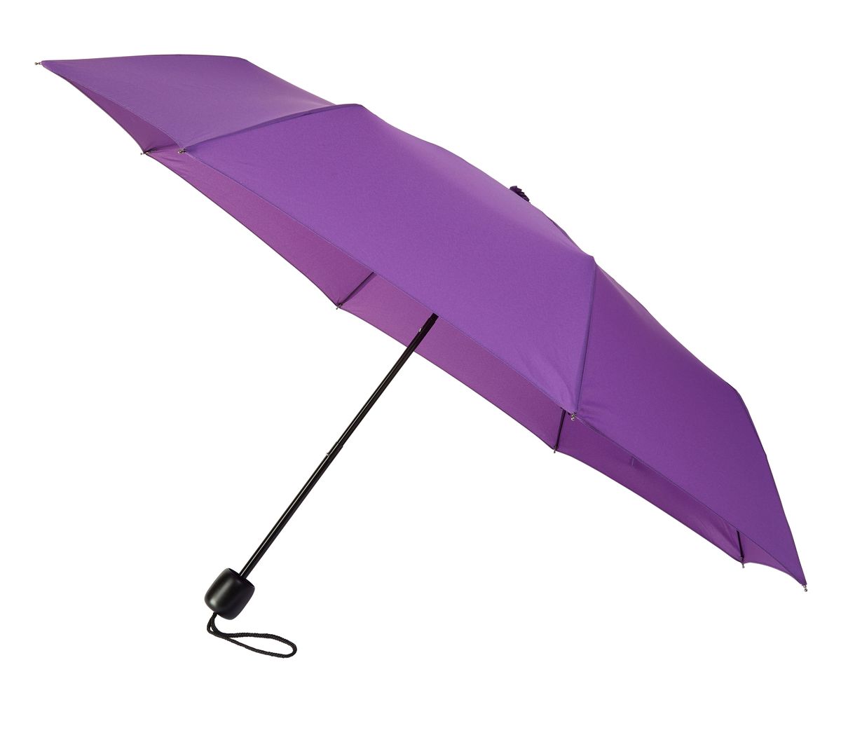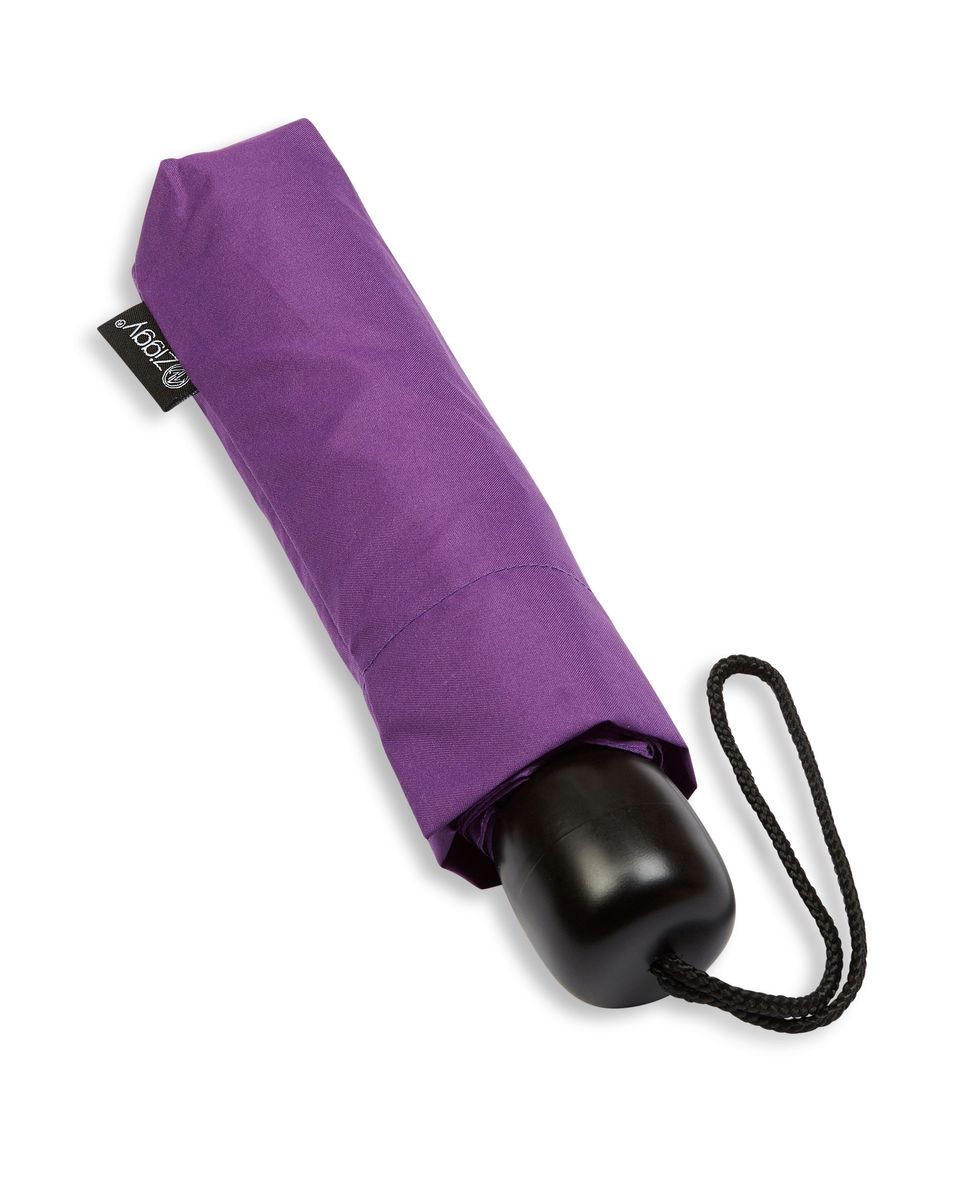 Compact and lightweight, this mini folding umbrella fits neatly into a handbag and includes a matching protective sleeve and wrist strap.