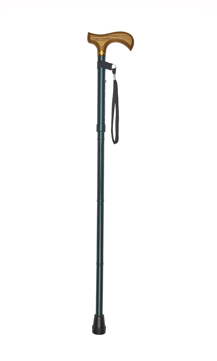 The aluminium walking stick is strong and lightweight and features a comfortable wooden derby-style handle.