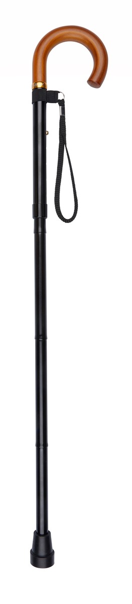 The aluminium walking stick is strong and lightweight and features a comfortable wooden crook-style handle.
